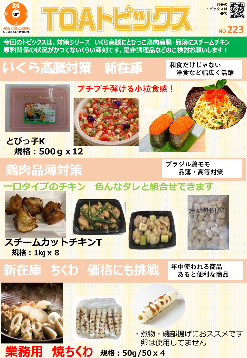 今回のトピックスは、対策シリーズいくら高騰にとびっこ鶏肉高騰・品薄にスチームチキン